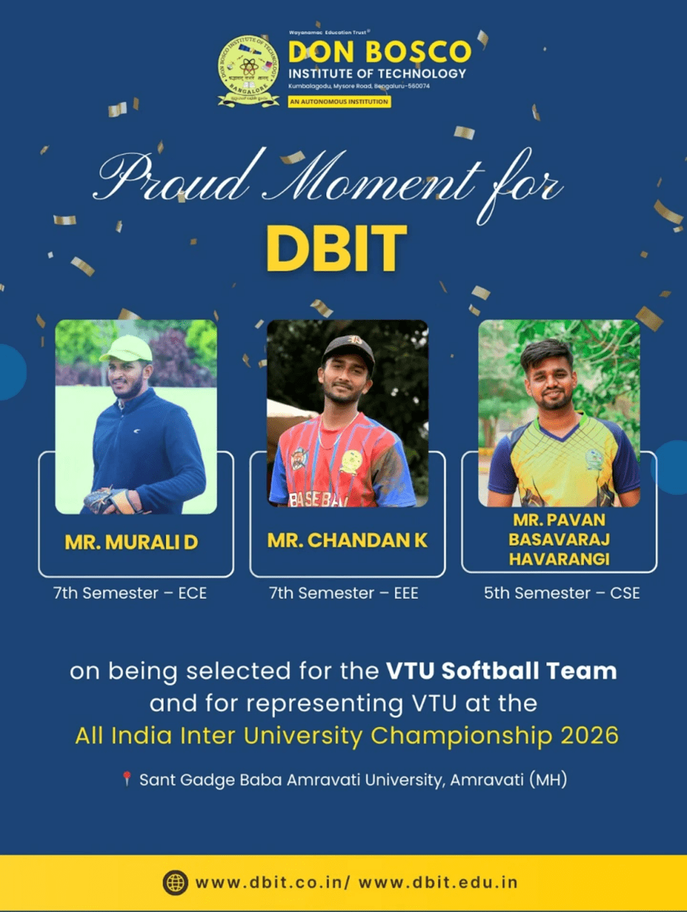 We are proud to share that Mr. Chandan K, Mr. Pavan Basavaraj Havarangi, and Mr. Murali D brought great honor to the DBIT family by being selected for the VTU Softball Team.