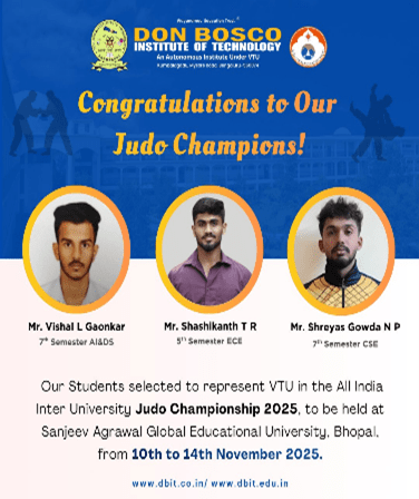 Three students from Don Bosco Institute of Technology (DBIT) were selected to represent Visvesvaraya Technological University (VTU) at the All India Inter-University Judo Championship 2025, held at Sanjeev Agrawal Global Educational (SAGF) University, Bhopal, Madhya Pradesh, from 10th to 14th November 2025.