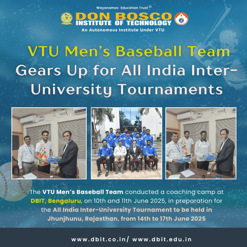The VTU Men’s Baseball Team conducted a focused coaching camp at Don Bosco Institute of Technology (DBIT), Bengaluru, on 10th and 11th June 2025, as part of their preparation for the All India Inter-University Baseball Tournament.