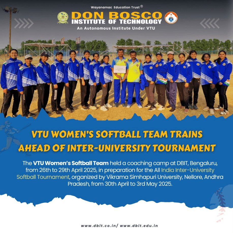 The VTU Women’s Softball Team successfully completed a coaching camp at Don Bosco Institute of Technology (DBIT), Bengaluru, from 26th to 29th April 2025, in preparation for the All India Inter-University Softball Tournament.