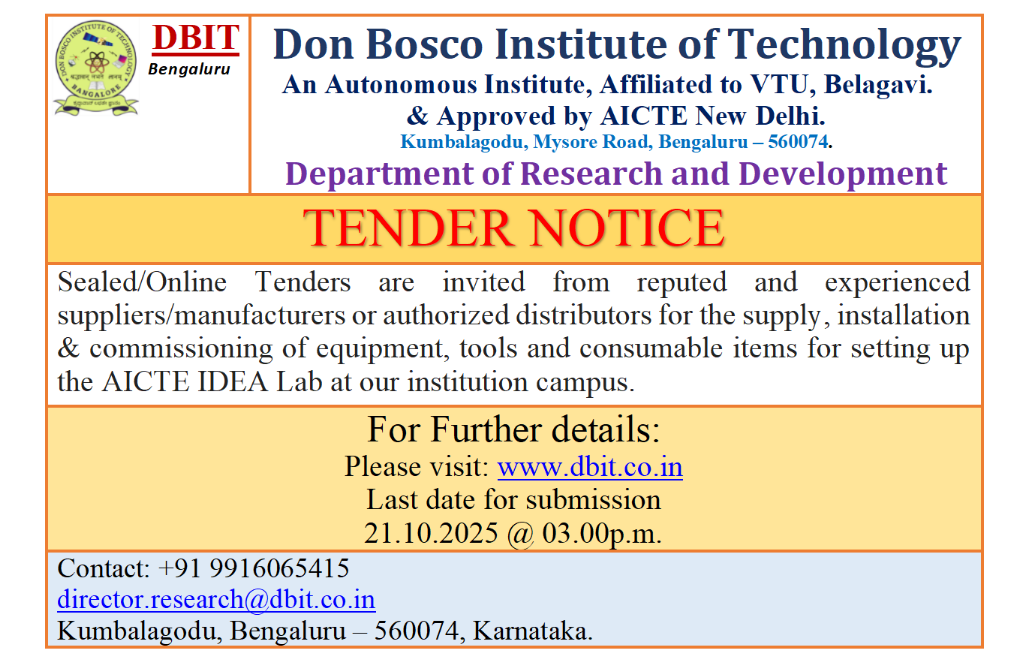 Reputed suppliers, manufacturers, and authorized distributors are invited to submit sealed tenders for the supply, installation, and commissioning of equipment, tools, and machines for establishing the AICTE–DBIT IDEA Lab.
