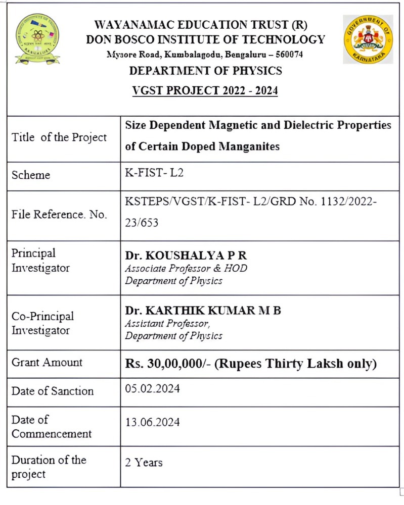 The Department of Physics at Don Bosco Institute of Technology, Bengaluru, was established in 2001 with a strong commitment to excellence in education and research. Over the years, the department has built a solid reputation, supported by a team of highly experienced teaching and technical staff. At present, four faculty members hold doctoral degrees, while the remaining faculty members are actively pursuing their Ph.D. programs to further enhance their academic and research expertise.