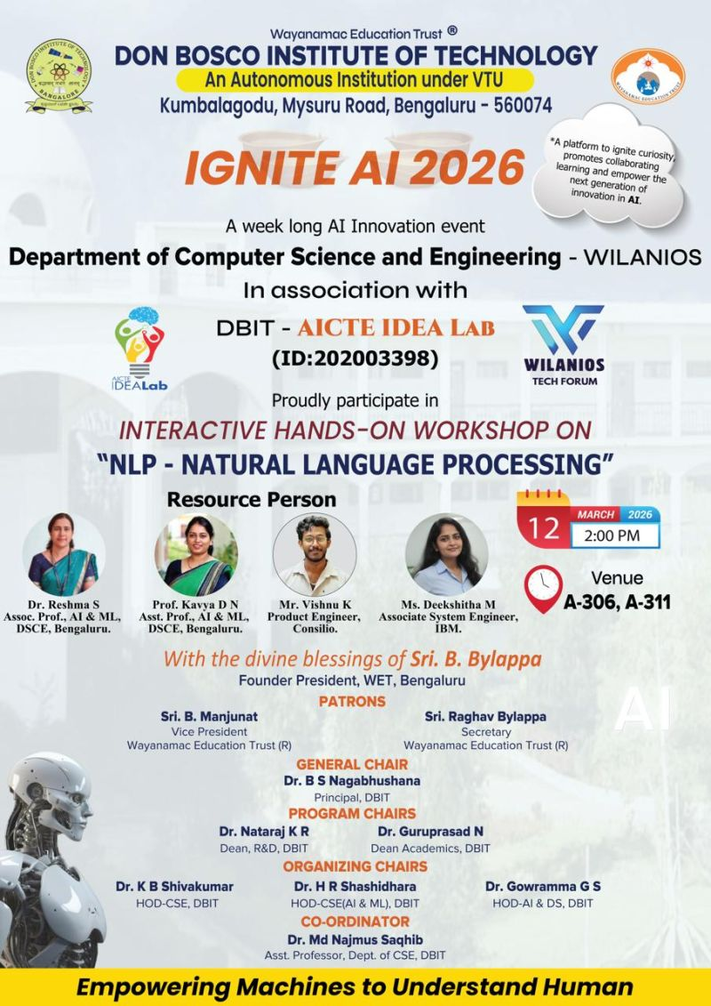 The Department of Computer Science and Engineering at Don Bosco Institute of Technology, Bengaluru, in association with AICTE IDEA Lab and WilaniOS Tech Forum, successfully conducted an Interactive Hands-on Workshop on Natural Language Processing (NLP) as part of the IGNITE AI 2026 innovation series on 12 March 2026 at the DBIT Campus.