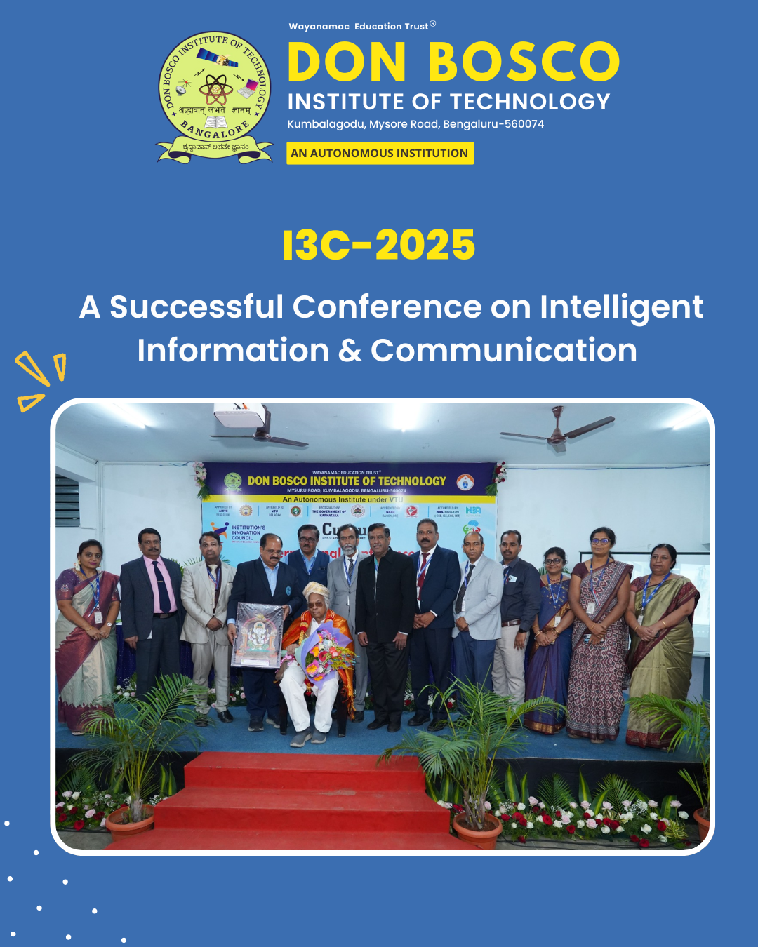 The International Conference on Intelligent Information and Communication (I3C-2025) was successfully organized by the R&D Department of Don Bosco Institute of Technology (DBIT), Bengaluru, on 30th and 31st May 2025, in association with Springer.I3C-2025 served as a dynamic national platform that brought together academicians, researchers, industry professionals, scientists, and students from across India to exchange ideas and present innovative research. The conference focused on emerging trends and applications in Cybernetics, Cognition, Communication Systems, Internet of Things (IoT), Data Science, and Machine Learning.The event featured distinguished keynote addresses by renowned experts, insightful technical paper presentations, and interactive discussion sessions that encouraged knowledge sharing and interdisciplinary collaboration. Participants gained valuable insights into cutting-edge research developments and real-world technological applications.With excellent participation and highly positive feedback, I3C-2025 successfully reinforced DBIT’s commitment to research excellence, technological innovation, and strong academia–industry collaboration, contributing meaningfully to the advancement of intelligent information and communication technologies.