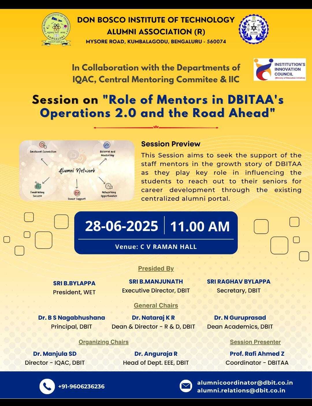 The DBIT Alumni Association (DBITAA), in collaboration with the IQAC, Central Mentoring Committee, and Institution’s Innovation Council (IIC), successfully organized an insightful session on “Role of Mentors in DBITAA’s Operations 2.0 and the Road Ahead.”