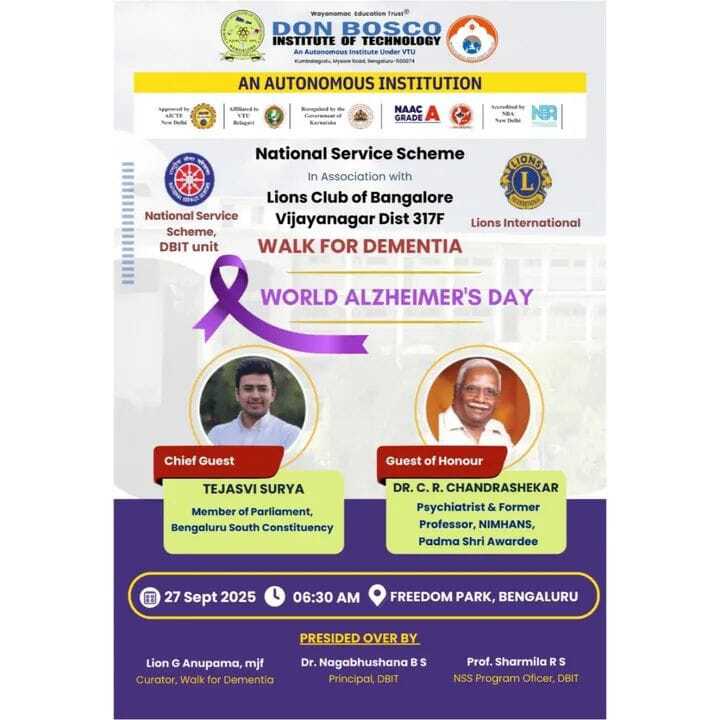 The Don Bosco Institute of Technology (DBIT), in collaboration with the Lions Club of Bangalore Vijayanagar, District 317F, proudly organized a Walk for Dementia on 27th September 2025 at Freedom Park, Bengaluru, to mark World Alzheimer’s Day.